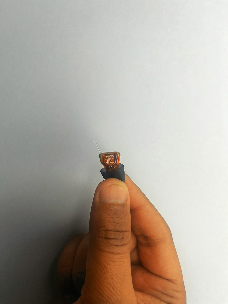 A CROS device is designed for people who have profound hearing loss in one ear that cannot be helped by a standard hearing aid. The Signia CROS IX is a transmitter worn on your "bad" ear. It captures all the sound from that side and wirelessly streams it to a compatible Signia IX hearing aid worn on your "good" ear. This allows you to hear sounds coming from your impaired side, giving you a sense of balanced, 360-degree hearing again.