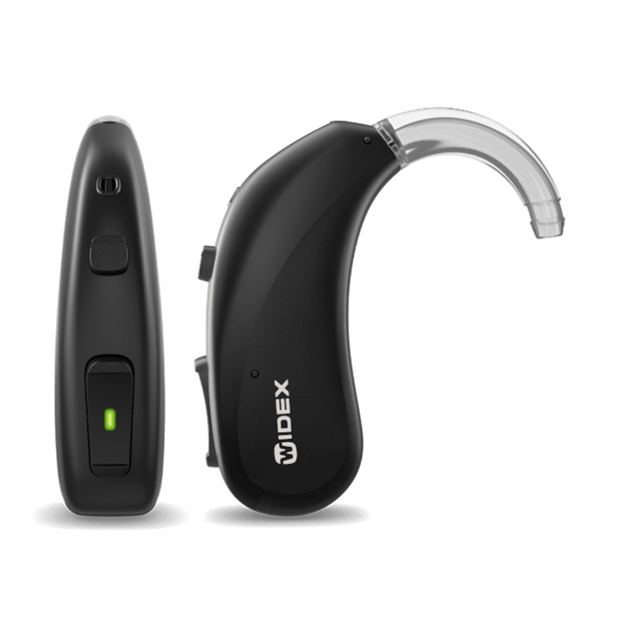 The Widex Moment BTE R D is a behind‑the‑ear (BTE) hearing aid from the Widex Moment™ family. “BTE” means the main body sits comfortably behind your ear, connected to a custom earmold or a standard dome via a thin tube. “R” indicates an integrated lithium‑ion rechargeable battery – no disposable batteries required. “D” stands for direct streaming compatibility with iPhones (MFi) and ASHA‑enabled Android devices. The BTE form factor is larger than RIC models, allowing for a more powerful amplifier, longer battery life, and additional physical controls. It is particularly well‑suited for individuals with mild to moderately severe hearing loss, with a fitting range of 40‑105 dB HL for the 440 and 330 levels, and 20‑105 dB HL for the 220 and 110 levels.